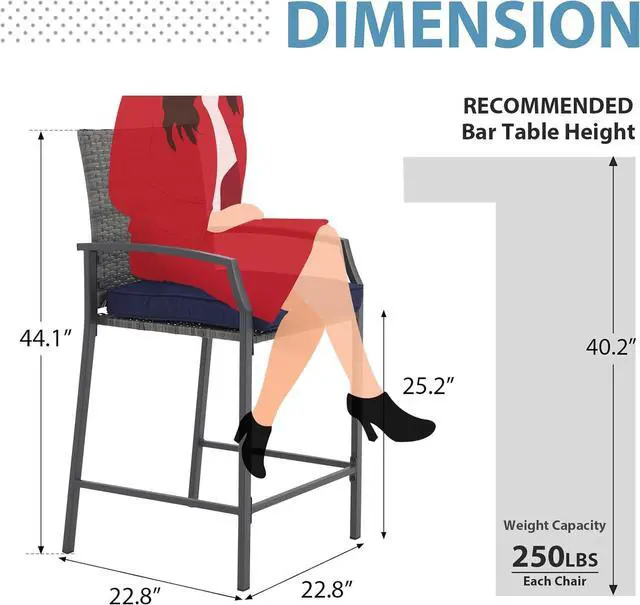 Durable Material: Our patio bar stools set is made of sturdy iron frame and hand-woven PE rattan, featuring a smooth-to-the-touch, rust- and crack-resistant. Each counter height bar stool can hold up to 250 LBS. Plus, non-slip pads on the feet add stability and protect the floor from scratches