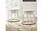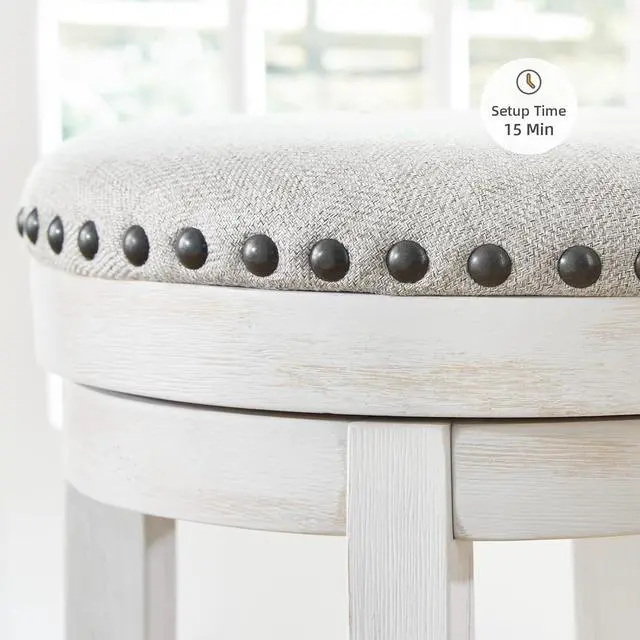 HANDSOMELY CRAFTED: This bar stool chair is made of wood in a vintage white finish, with a black metal footrest. Its cushioned seat is upholstered with beige woven fabric