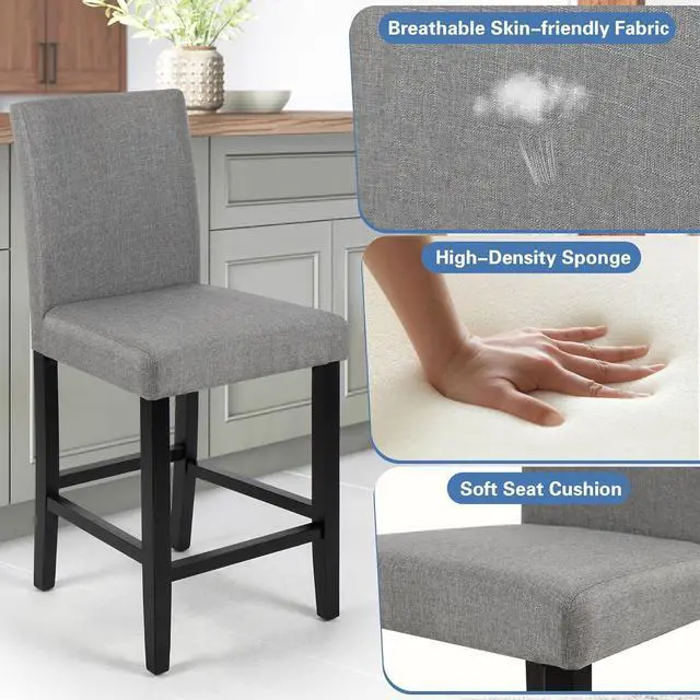 Design: Bar stools make ergonomically curved backrest can relieve back fatigue effectively; Cushion of barstools with thick sponge and soft fabric provide enough support and superior comfort for sitting