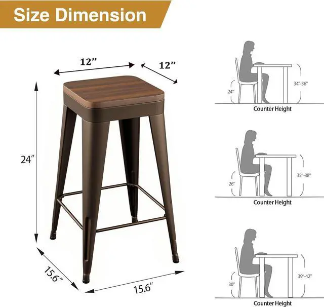 DIMENSIONS: 15.6 " (L) x 15.6 " (W) x 24" (H), Seat Area 12" * 12", Seat Height 24". All necessary hardware and instructions are included in the package. Please check the bar height chairs height before you make the order to match your space. If you have any problems, please let me know.