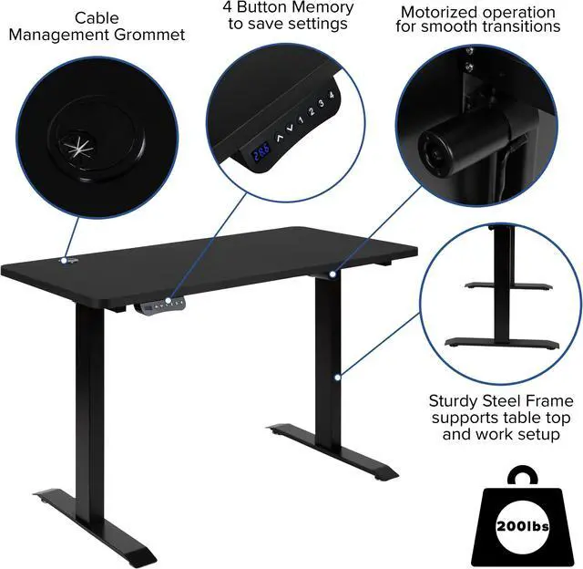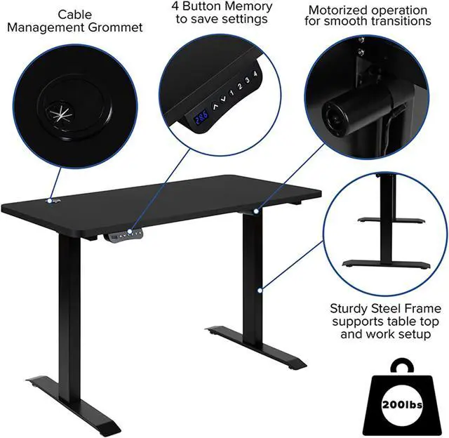 Improve productivity while also improving your mood with an adjustable computer standing desk. Whether in the office or working from home we spend a lot of time at our computer desk and a sit to stand desk offers a well-rounded design to get you through your work day. Adjustable desks support working at various seated heights with a regular desk chair or drafting chair. Transition from sitting to standing with the smooth motor mechanism. There's no work involved with this electric height adjustable desk, simply push the up and down arrow buttons. Four preset memory buttons allow you to save your favorite settings whether you share the desk or are the sole user.