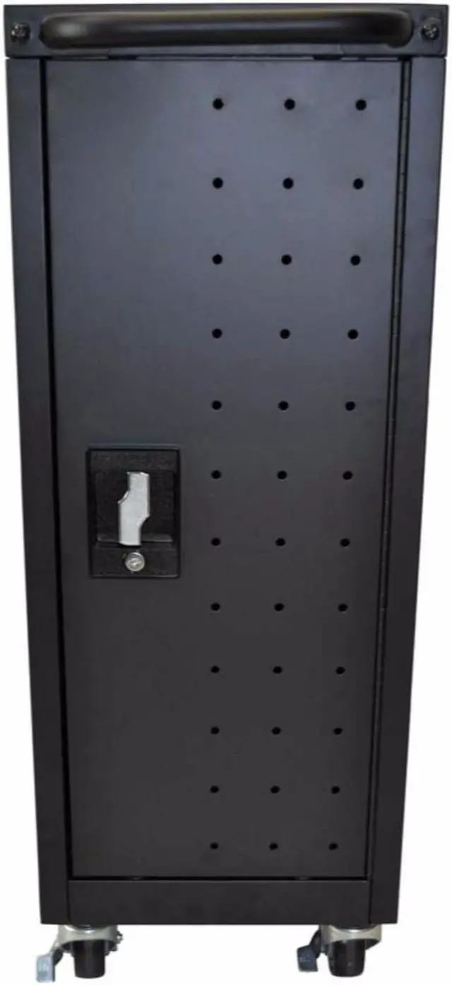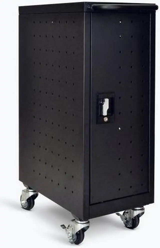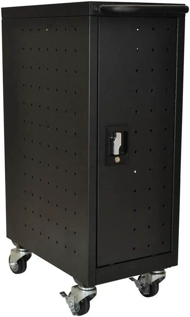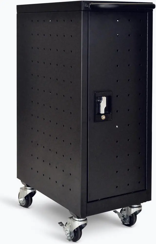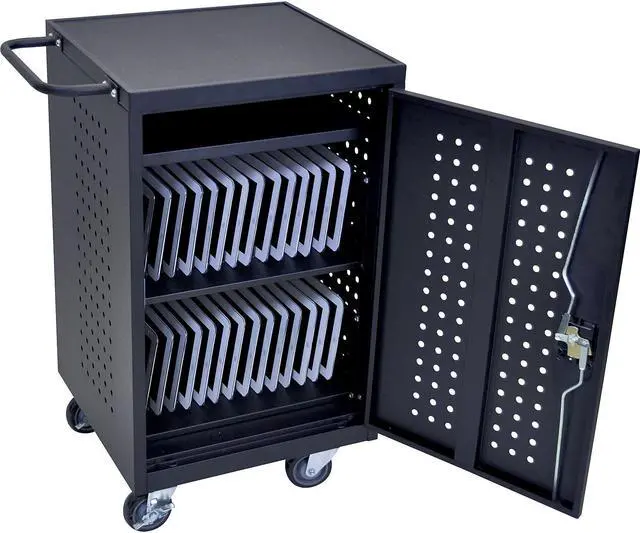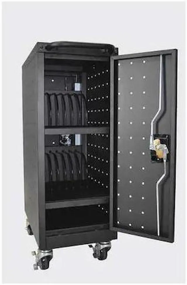 Luxor Tablet / Chromebook Charging Carts safely charge, store and transport tablets and Chromebooks to meet the evolving IT needs of classrooms and dynamic work environments. A strong, simple design with lockable steel doors provides rugged security and storage while inside, an electrical assembly and cord management system keep things organized and charged up. Rubber-coated dividers won't scratch devices and help provide impact protection during transit, which is made easy even when fully loaded thanks to rolling casters and a full-length handle. And the cabinet requires minimal assembly simply attach the casters and handle. Charges, stores and transports up to 16 tablets or Chromebooks (8 per shelf). Rubber-coated dividers safeguard devices from damage. All-steel construction and padded top surface. Ventilated on all four sides, allowing air to circulate freely through the unit. Bottom storage shelf for storing additional IT items. Four 3" casters, two with locking brakes, and handle for easy maneuverability and stability. *Special Note:* Due to the latest, larger size of the 20W Apple iPad and Samsung Chromebook USB-C charging block adapters, only half of the available plug outlets are accessible in this unit.
