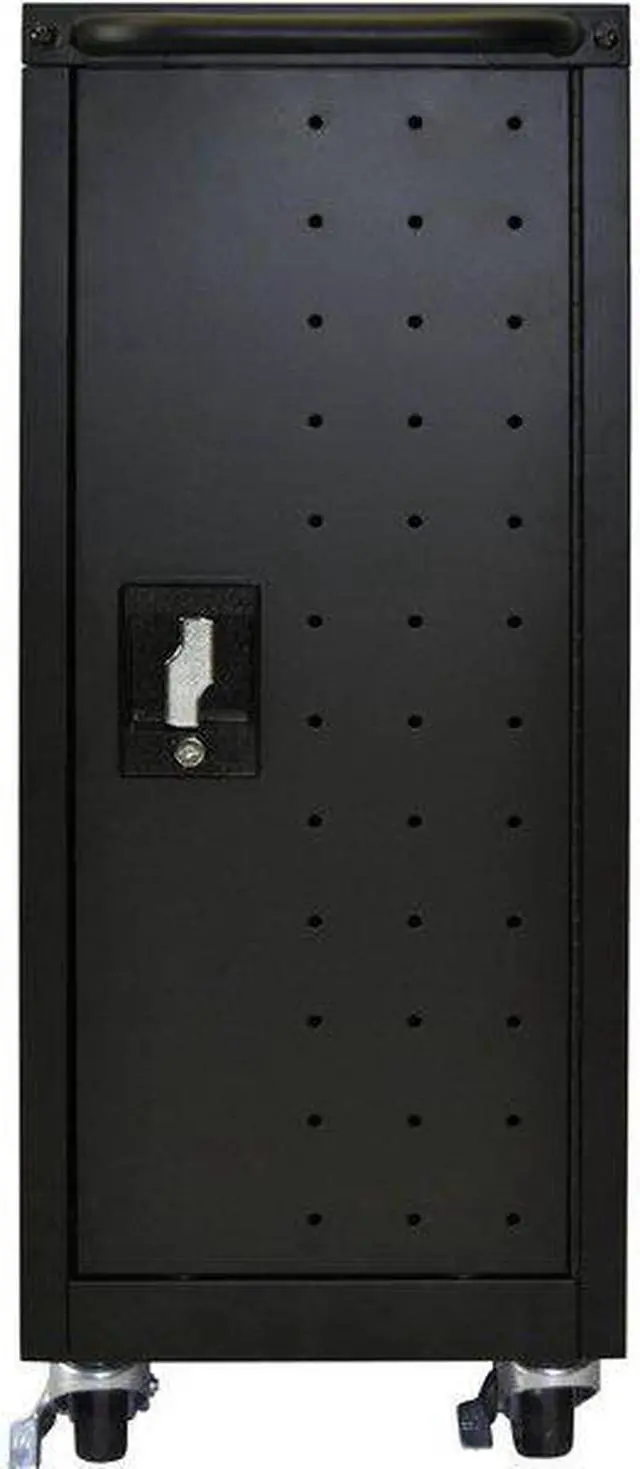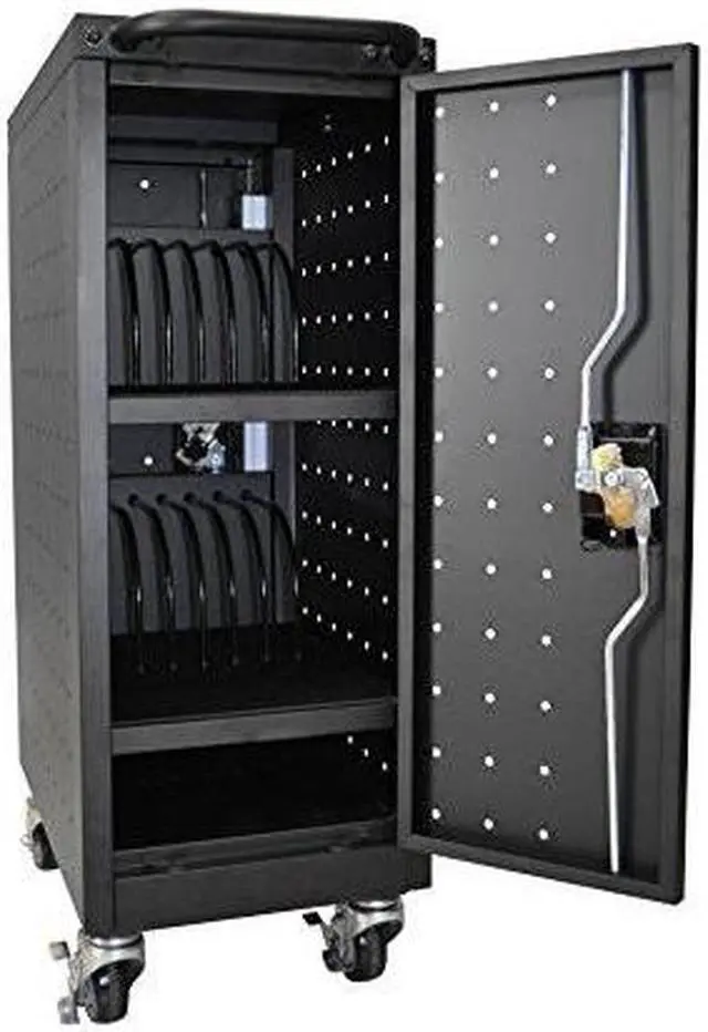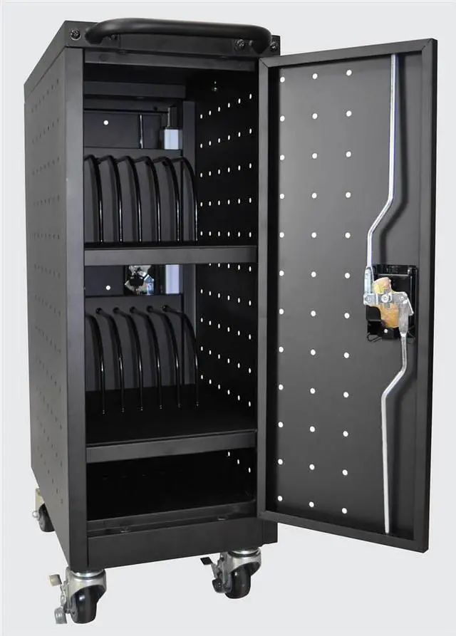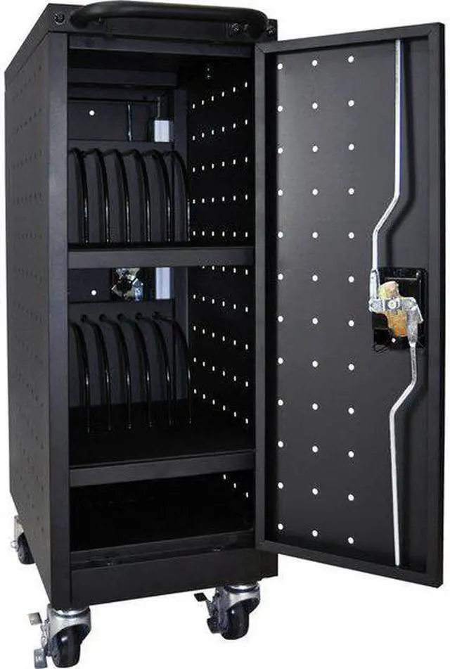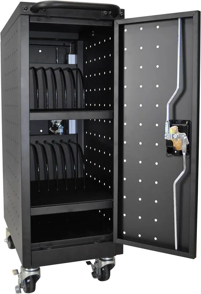 Luxor Tablet / Chromebook Charging Carts safely charge, store and transport tablets and Chromebooks to meet the evolving IT needs of classrooms and dynamic work environments. A strong, simple design with lockable steel doors provides rugged security and storage while inside, an electrical assembly and cord management system keep things organized and charged up. Rubber-coated dividers won't scratch devices and help provide impact protection during transit, which is made easy even when fully loaded thanks to rolling casters and a full-length handle. And the cabinet requires minimal assembly simply attach the casters and handle. Charges, stores and transports up to 16 tablets or Chromebooks (8 per shelf). Rubber-coated dividers safeguard devices from damage. All-steel construction and padded top surface. Ventilated on all four sides, allowing air to circulate freely through the unit. Bottom storage shelf for storing additional IT items. Four 3" casters, two with locking brakes, and handle for easy maneuverability and stability. *Special Note:* Due to the latest, larger size of the 20W Apple iPad and Samsung Chromebook USB-C charging block adapters, only half of the available plug outlets are accessible in this unit.