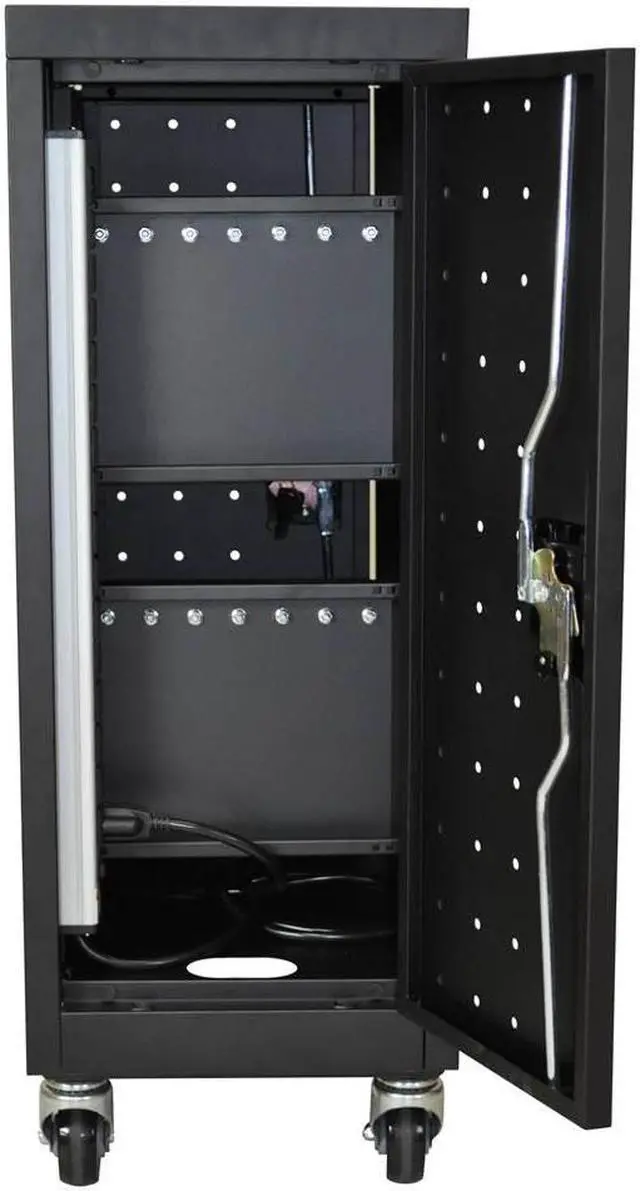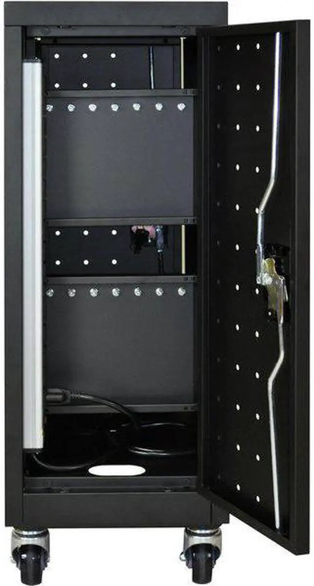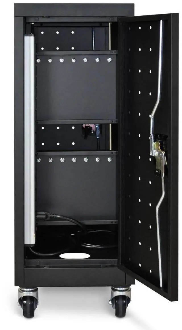 Dimension: 12"W x 20.25"D x 34"H. Divider Slots: 1"W. Cord Length: 10 feet.Includes UL-Listed 16-outlet 120V/15A vertical electrical power strip.Maximum weight capacity of 75 lbs. (evenly distributed).Locking front and rear access doors; includes two keys.Shelves: 12"W x 15.25"D with 10"H of top clearance. *Special Note:* Due to the latest, larger size of the 20W Apple iPad and Samsung Chromebook USB-C charging block adapters, only half of the available plug outlets are accessible in this unit.
