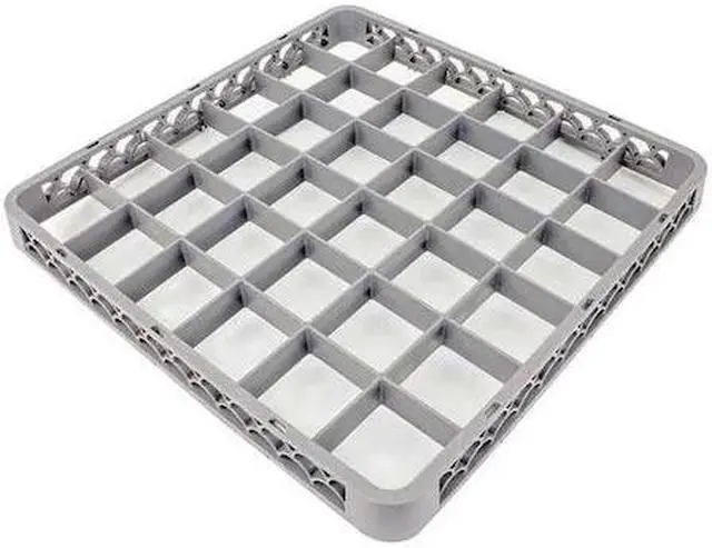 Dish Rack, Overall Length (In. ) 19-1/2, Overall Width (In. ) 19-1/2, Overall Height (In. ) 1-1/2, Overall Depth (In. ) 19-1/2, Exterior Length (In. ) 19-1/2, Exterior Width (In. ) 19-1/2, Inside Length (In. ) 18-1/4, Inside Width (In. ) 18-1/4, Number of Compartments 36, Compartment Size (In. ) 3 x 3, Max. Handling Temp. (Deg. F) 210, Color Gray, Material Plastic, Inside Rack Length (In. ) 18-1/4, Inside Rack Width (In.