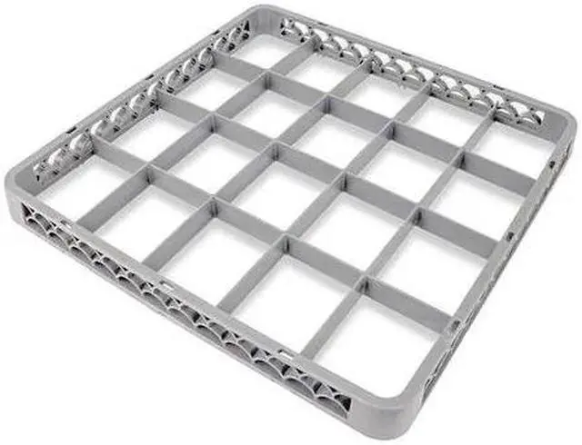 Dish Rack, Overall Length (In. ) 19-1/2, Overall Width (In. ) 19-1/2, Overall Height (In. ) 1-1/2, Overall Depth (In. ) 19-1/2, Exterior Length (In. ) 19-1/2, Exterior Width (In. ) 19-1/2, Inside Length (In. ) 18-1/4, Inside Width (In. ) 18-1/4, Number of Compartments 20, Compartment Size (In. ) 3-5/8 x 4-1/2, Max. Handling Temp. (Deg. F) 210, Color Gray, Material Plastic, Inside Rack Length (In. ) 18-1/4, Inside Rack Width (In.