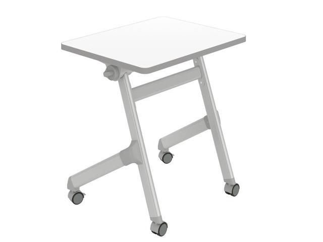 Rectangular desks nest together to save space, with 5 between desk surfaces when nested.