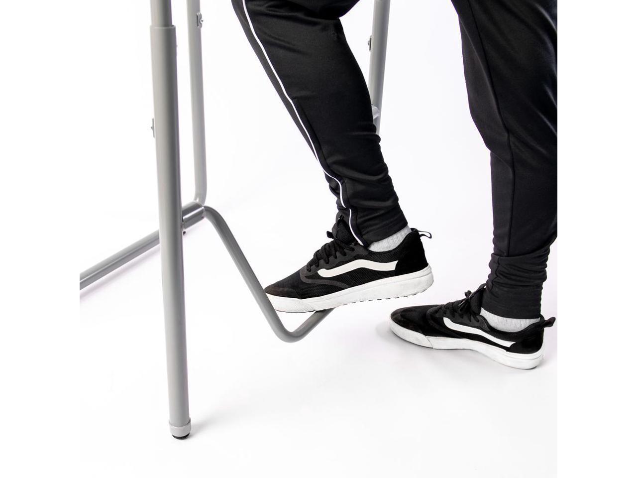 Durable, clean design with powder-coated steel frame and high-pressure pebble gray laminate with 3mm edge banding. Assembly required. Health-positive design with height adjustability and pendulum footrest promotes constant movement.