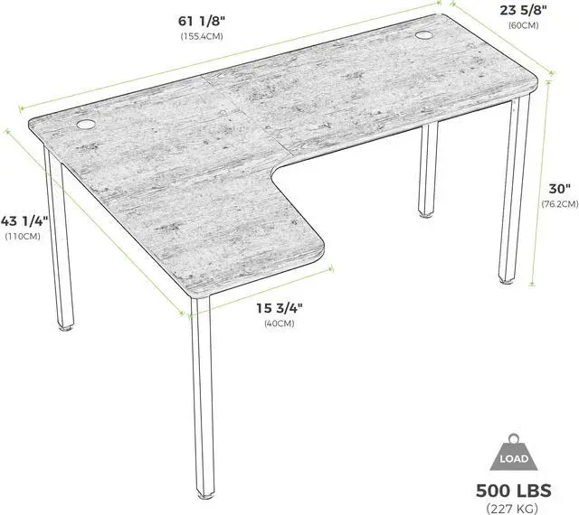 Larger desktop surface: The L shape corner gaming desk measures 61"(L) x 43"(W) x 30"(H). The 30-inch-high large legroom underneath, provide ample space to stretch your legs freely or storing file cabinet.