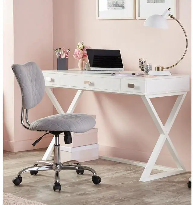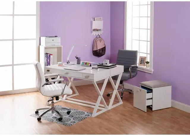 Small desk (48" wide or smaller) - recommended for a small or shared space. Assembly required. Features a white finish with silver hardware. Tested to meet ANSI/BIFMA Performance Standards - Manufacturer testing has been conducted on this product to meet specific performance requirements and safety standards set forth by the American National Standards Institute (ANSI) and the Business and Institutional Furniture Manufacturers. This product is heavy and/or oversized and may need more than one person to handle. Interested in in-home assembly? Please call our certified and insured professional assemblers 866-388-4350 today!
