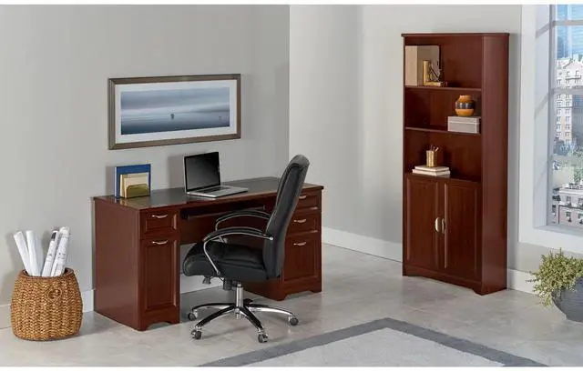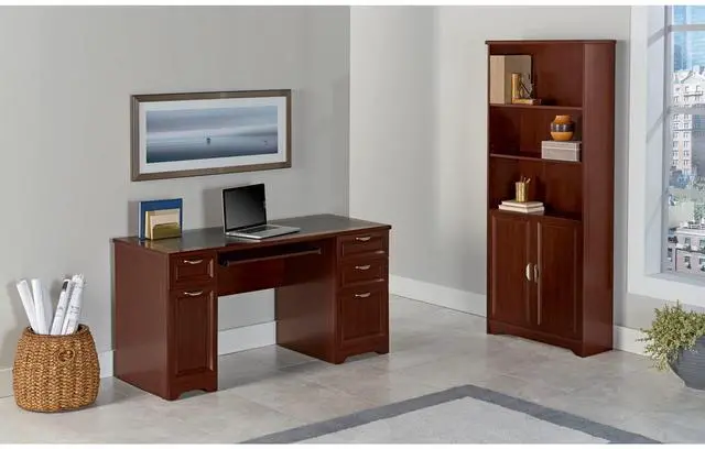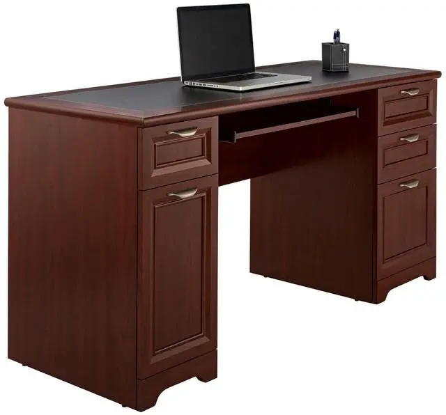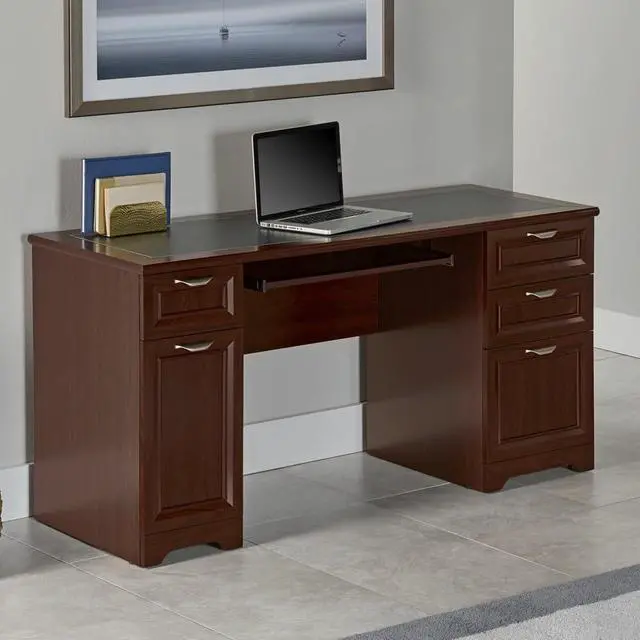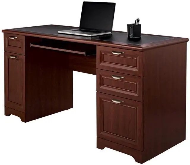 Work comfortably on this Realspace Magellan manager's desk. The slide-out keyboard tray conveniently holds your computer's keyboard, while the file drawer keeps paperwork neatly tucked. Featuring a paper laminate finish, this desk resists scratches and endures water spills for lasting use. This 59-inch Realspace Magellan manager's desk features 3 box drawers for storage, and the medium-density fiberboard provides sturdy support. Medium-density fiberboard material for sturdy support. Slide-out keyboard tray. 4 drawers for neat storage of supplies. Medium desk recommended for home or professional use. Magellan desk with a classic cherry finish.