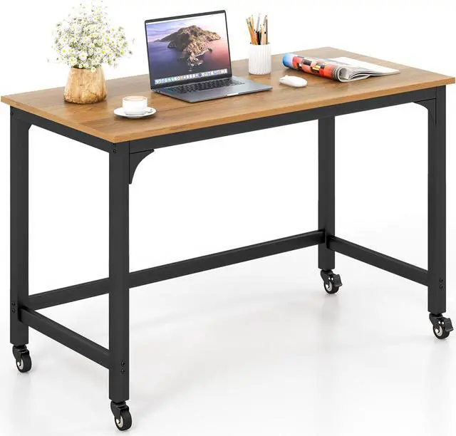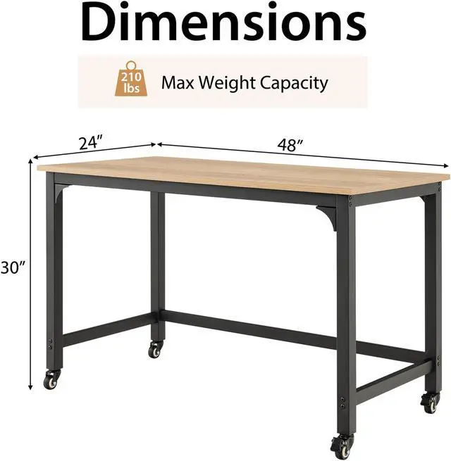 Boost your productivity and transform your workspace with our deluxe mobile desk! Whether youre working from home, tackling homework, engaging in creative crafts, or embarking on exciting DIY projects, our state-of-the-art desk is your ultimate companion. With its high-quality thickened tabletop, youll have the ease and confidence to conquer any task. Supported by a robust metal frame that can withstand a remarkable 210 lbs, this writing desk exudes unwavering stability, thanks to its triangular reinforced structure and sturdy crossbars. Effortlessly glide the desk wherever you desire with its smooth, silent casters, and lock 2 of them for rock-solid stability. Choose from our sleek matte black finish or stunning wood grain design to effortlessly blend with any decoration. Take control of your workspace today!