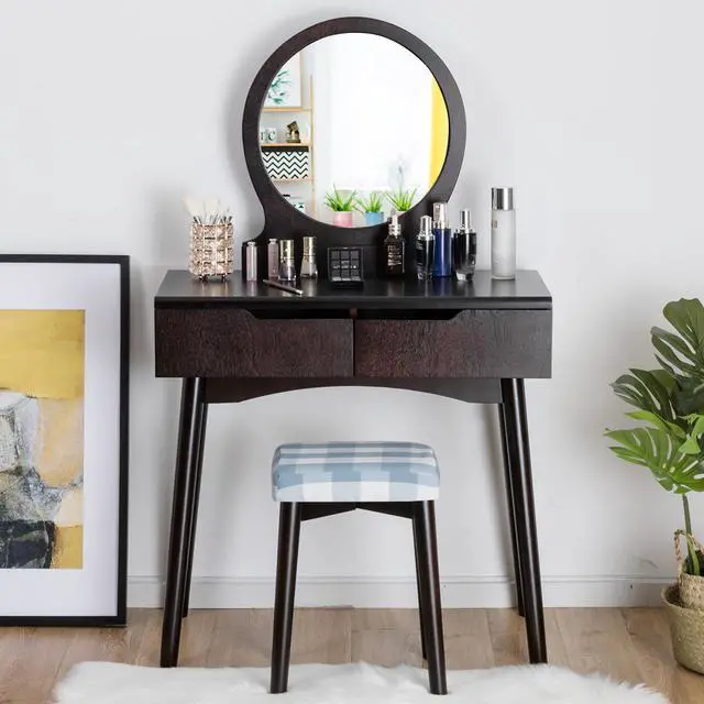 Start your nice day from making up with this concise vanity setIt will never let you down with practical functions as well as charming appearance. With 2 large drawers and a spacious tabletop, theres plenty of room for a variety of brushes, bottles, and accessories. Featuring a large round mirror, it is easy to make up perfectly by looking at it. Equipped with a secluded tilting preventing device, the dresser can be fixed to the wall to prevent to crush people from falling. Painted with environmentally friendly coating, this set has no horrible smell. Its elegant appearance will compliment many décor designs and room colors easily. The top of the dresser is made of thick board and legs of table and stool are made of solid wood to ensure stableness and this set can be used for many years. Give yourself or loved one a perfect gift.