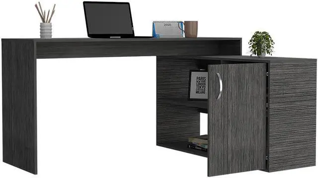 This L-Shaped Home Office Desk is a polished, practical instrument for your home office, optimizing space due to its corner-friendly design. The main desk offers more than enough space for you to do your daily due diligence, while the perpendicular desk offers extra top surface space, two open shelves, and a spacious storage cabinet. Smoky Oak Finish