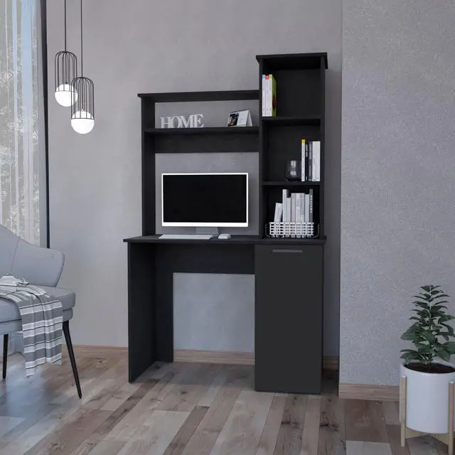 Rumford Computer Desk: the epitome of functionality meeting style. This desk, in either a sophisticated black, white or light gray manufactured wood finish, offers a spacious 38.7"W X 17.7"D work area. Above, a convenient hutch provides extra storage while three-tier shelves cater to your organization's needs. A lower cabinet with a single door and internal storage neatly conceals more oversized items. Elevate your workspace with Rumford's balance of design and utility.