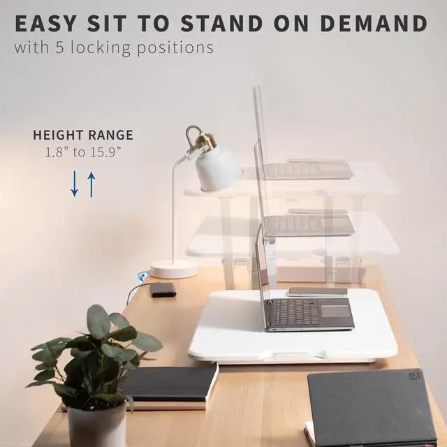Enjoy an ergonomic workspace with the White 26" Single Top Desk Riser (DESK-V001JW) from VIVO! This single-tiered platform sits on top of your current desk and gives you the benefit of standing or sitting on demand. The compact size saves space on your table top while allowing you to raise the height of your monitor (or laptop) and keyboard. Transitioning between sitting and standing throughout the long work day provides numerous health benefits, such as increased blood flow, reduced aches and pains, and heightened alertness and productivity. Five lockable height settings allow you to customize the riser to your preferred position at just the squeeze of a handle!