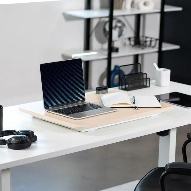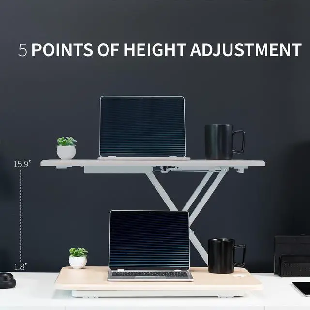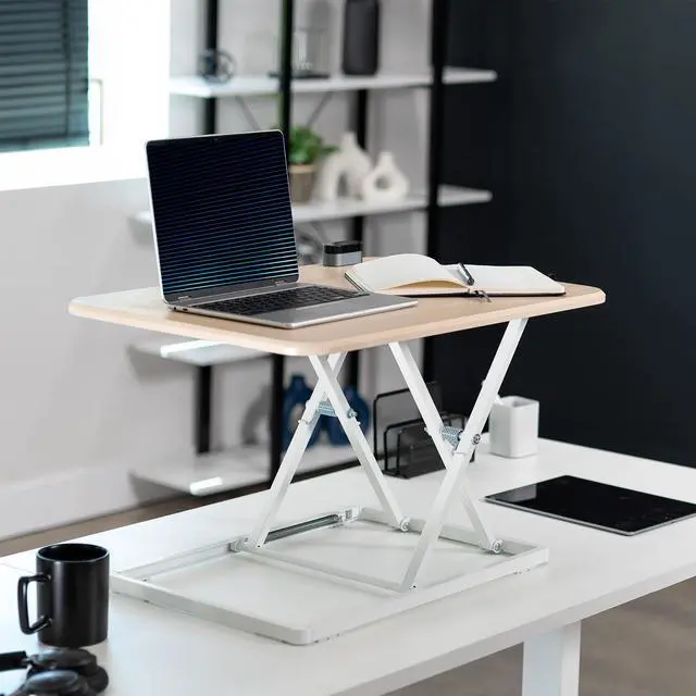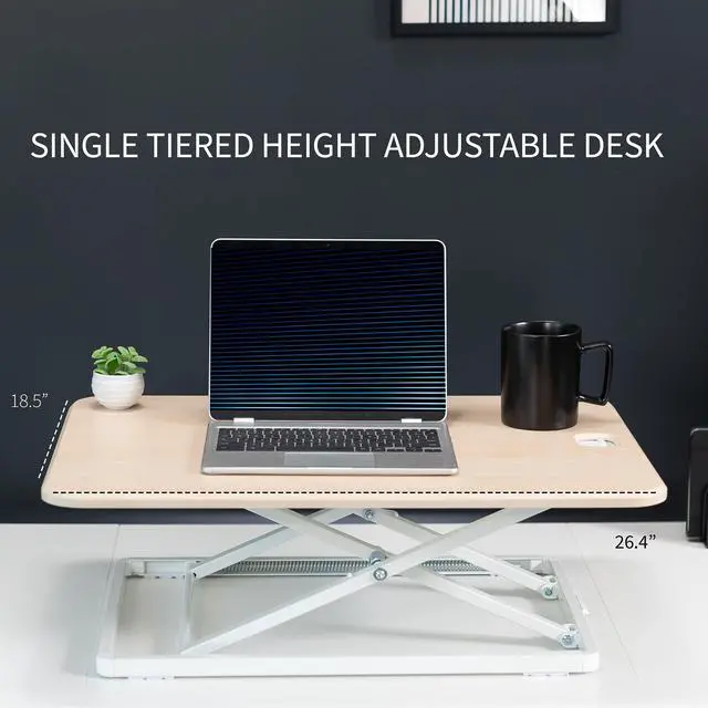 Enjoy an ergonomic workspace with the Light Wood / White 26" Single Top Desk Riser (DESK-V001JF) from VIVO! This single-tiered platform sits on top of your current desk and gives you the benefit of standing or sitting on demand. The compact size saves space on your table top while allowing you to raise the height of your monitor (or laptop) and keyboard. Transitioning between sitting and standing throughout the long work day provides numerous benefits, such as increased blood flow, reduced aches and pains, and heightened alertness and productivity. Five lockable height settings allow you to customize the riser to your preferred position at just the squeeze of a handle!