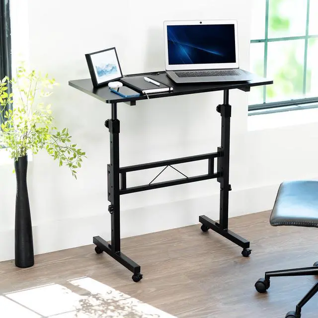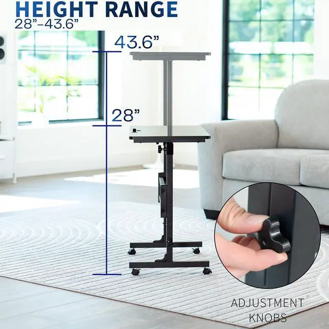 Laptop work just got easier with the Black Mobile Computer Workstation (CART-V02A) from VIVO! This small rolling desk fits easily in any workspace with its minimalist design and small footprint. The frame is made of sturdy steel and features built-in height adjustment with 5 locking intervals. Set the height low enough to work from an ergonomic sitting position, or raise to a comfortable standing position (minimum height: 28", maximum height: 43.6"). Locking casters make your portable desk stationary or mobile when desired, and the maximum total recommended weight is 44 lbs. All hardware and instructions are provided, so you can get your small standing desk assembled and improve work comfort in no time!