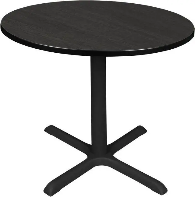 Whether you're planning a lounge, cafe, library, breakroom or restaurant, let the Cain Collection take you there. These versatile tables are at home in stylish cafe or coffee shop settings as well as lunch rooms. This 42-inch round table is constructed of a thermal fused melamine Ash Grey laminate tabletop that is 1-inch thick and finished with a black T-Mold edge band. Laminates are scratch, stain and scald resistant and wipe clean easily. The stylish X-Base is constructed of a tubular steel post and solid steel X-Base. Hidden adjustable glides keep the tabletop level and are easy to adjust.
