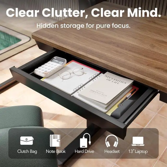 Easy Charging & Storage: The front panel of this height adjustable desk features built-in USB-A and USB-C ports to conveniently charge your phone, smartwatch, or other devices. The pull-out drawer offers extra space to store your office supplies, keeping everything organized.