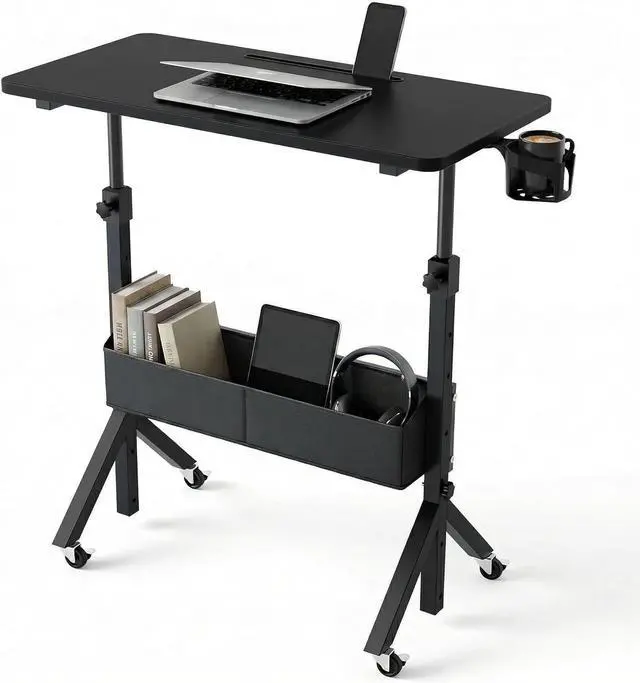 Practical Storage Basket:Built-in storage basket supports up to11 lbs (5 kg) for books,,headphones, or power strips. Keeps your workspace organized and makes this standing desk with wheels or rolling standing desk,Storage Bag Allows temporary storage of items on the desktop while moving, preventing them from sliding off." active home office experience for apartments or small spaces.