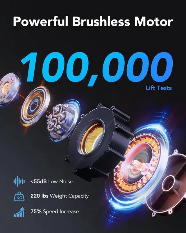 Quite & Faster Brushless Motor <55 dBEquipped with a powerful brushless motor, this adjustable desk delivers 75% faster lifting speed while maintaining a quiet operation at less than 55 dB. Tested for over 100,000 lift cycles, th e sit to stand desk ensures excellent stability and long service life.