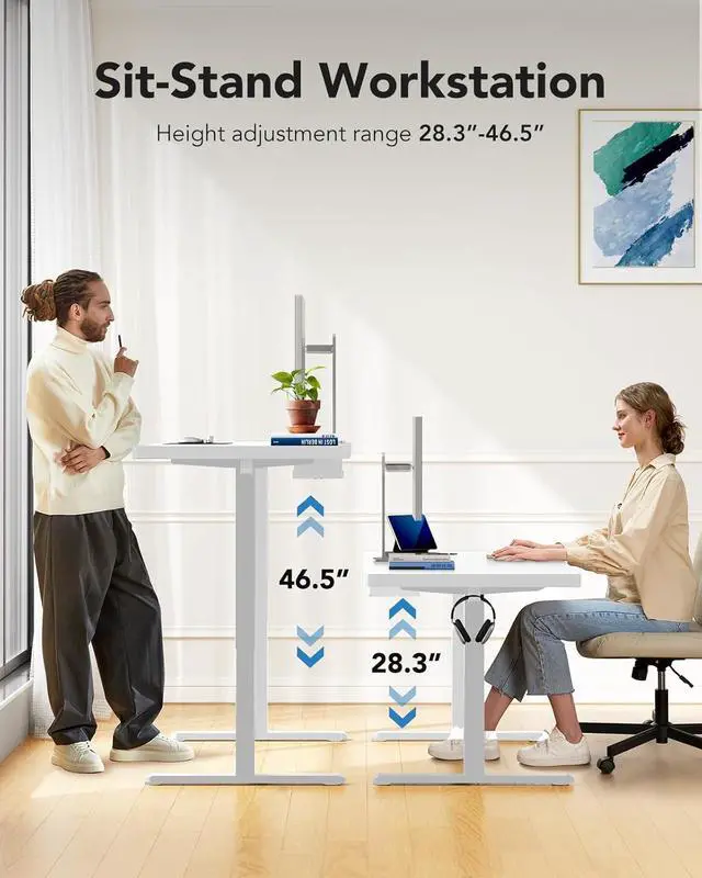 Seamless Height Adjustable Sit-to-StandThe adjustable computer desk can be smoothly adjusted from 27.9 to 46.5 in height, allowing you to choose the perfect level for sitting or standing. 4 memory preset buttons make this height adjustable standing desk easy to transition between your favorite heights throughout the day.