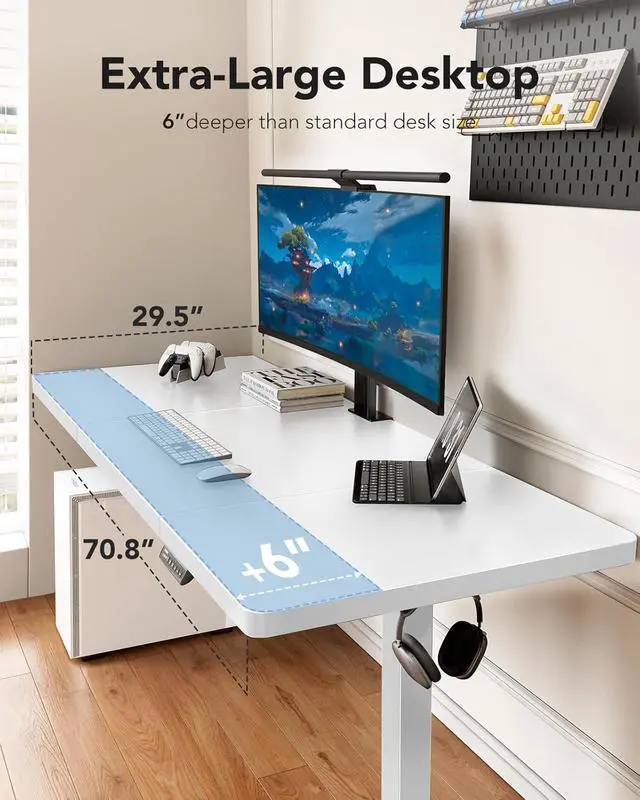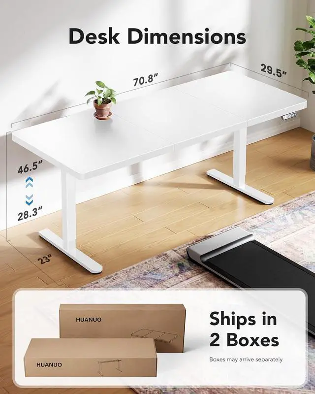30 Extra Spacious DesktopThis standing desk features a spacious desktop measuring 71 wide x 30 deep, provides plenty of space for multiple monitors, laptops, printer, or other work essentials. Please Note: For safe delivery, the desktop and frame will be split into 2 packages, which may arrive separately, If you have any qusestion, our customer support team is here to back you up.
