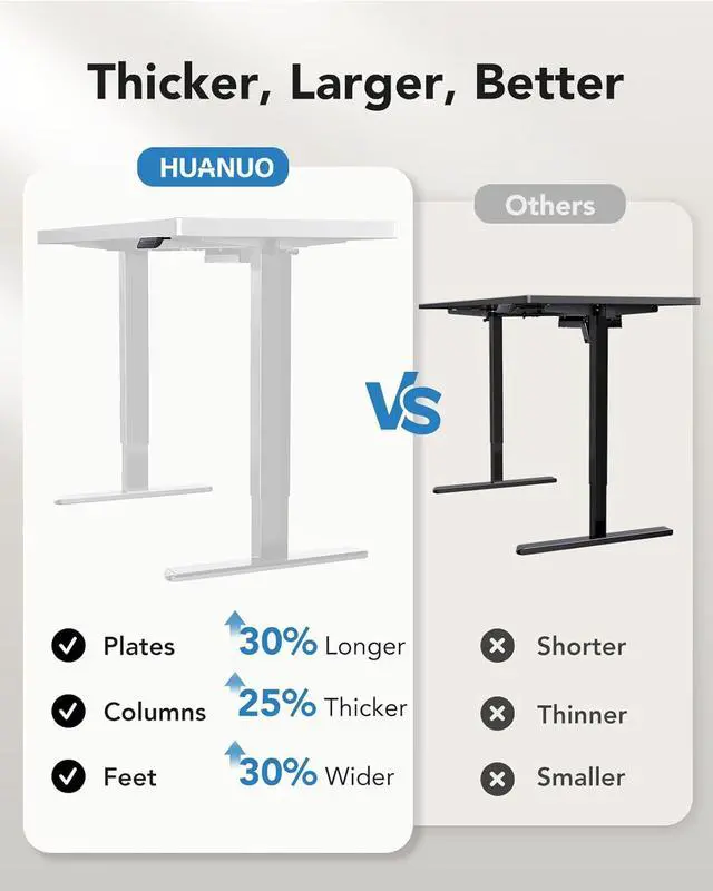 Larger and Thicker Frame Supports 220 LBSThe standing desk frame is made from high-quality carbon steel with 30% longer plates, 25% thicker columns, and 30% wider feet. These enhancements to the stand up desk legs provide increased strength and support to hold large desktops with heavy equipment up to 220 lbs.