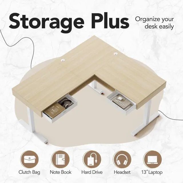 Storage Plus: Tired of desktop chaos? The Storage Plus system of our standing desk is your secret weapon. Tuck away your clutch bag, notebooks, hard drives, headset, and even your 13 laptop into 2 dedicated fabric drawers. Keep your workflow moving with open compartments on top for your go-to items. With the integrated storage sulotions, it transforms clutter into clarity, and make distraction become deep focus