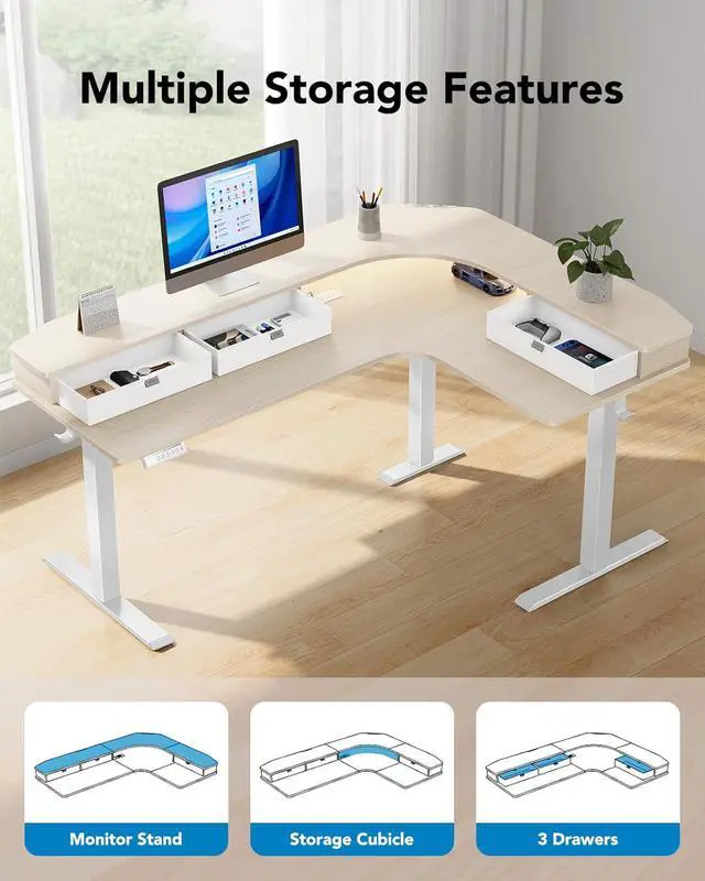 HUANUO 65 L-Shaped Standing Desk with Power Outlets & LED Strip, Electric Height Adjustable Corner Computer Desk, Sit Stand Up Desk with 3 Drawers, Natural Wood