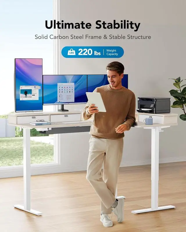 Tested Durability, Trusted Quality: Huanuo adjustable desks are tested to withstand 50,000 lift cycles for long-lasting performance. Equipped with dual motors for smooth, steady lifting, the standing desk can support up to 220 lbs thanks to a solid carbon steel frame.