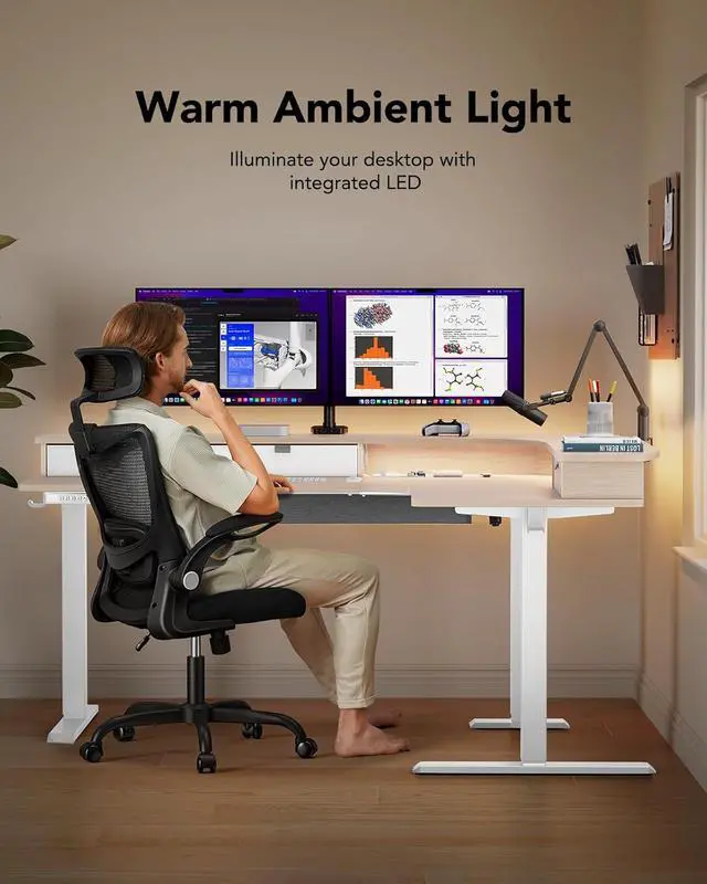 Ergonomic L-Shaped Desk: Extend your workspace with this L-shaped desktop that provides room for separate work and personal task areas. You can position your chair in the corner with a desktop on either side to rest your arms.