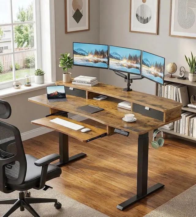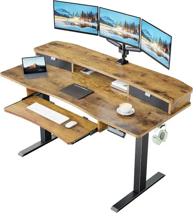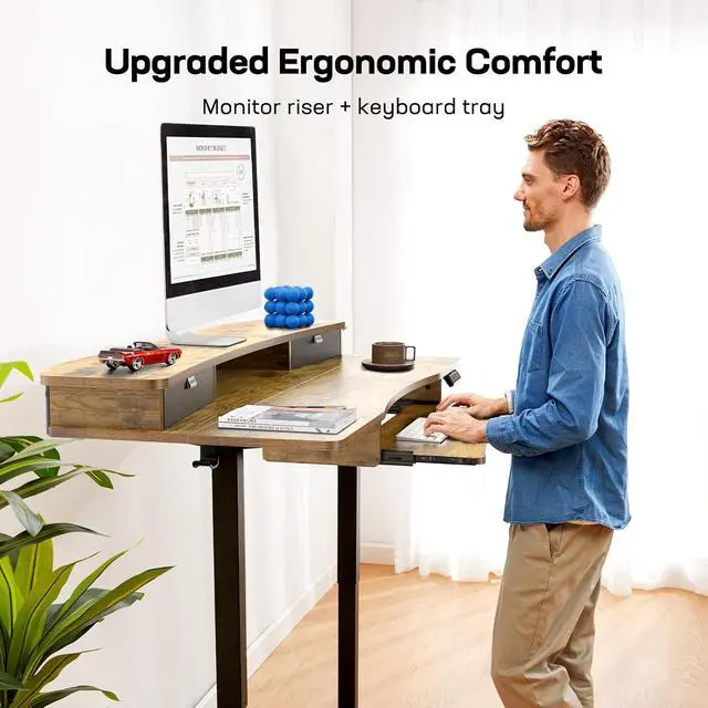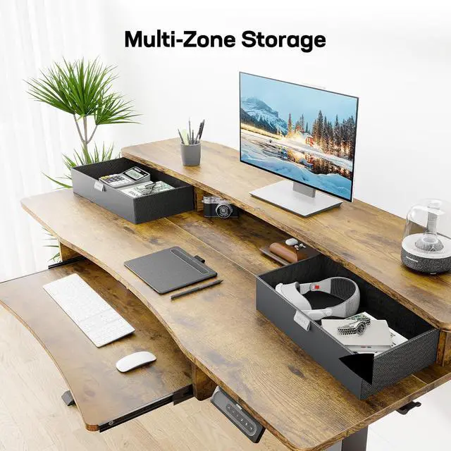 1. Multi-Zone Storage: The table top of this standing desk is made up of two boards. The computer desk with keyboard tray is designed with two drawers to store office supplies, an integrated monitor stand to display photos and collectibles, and an open cubicle for easy access to books or accessories. Experience improved productivity and comfort with a clutter-free and organized workspace.
