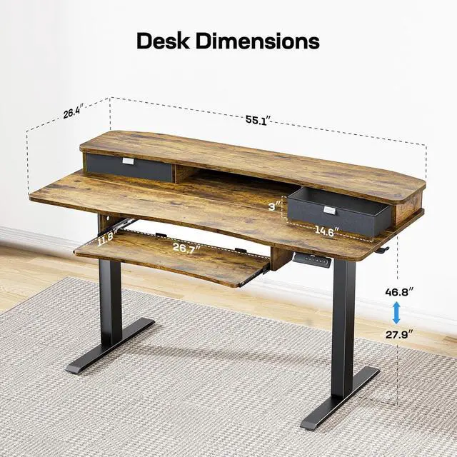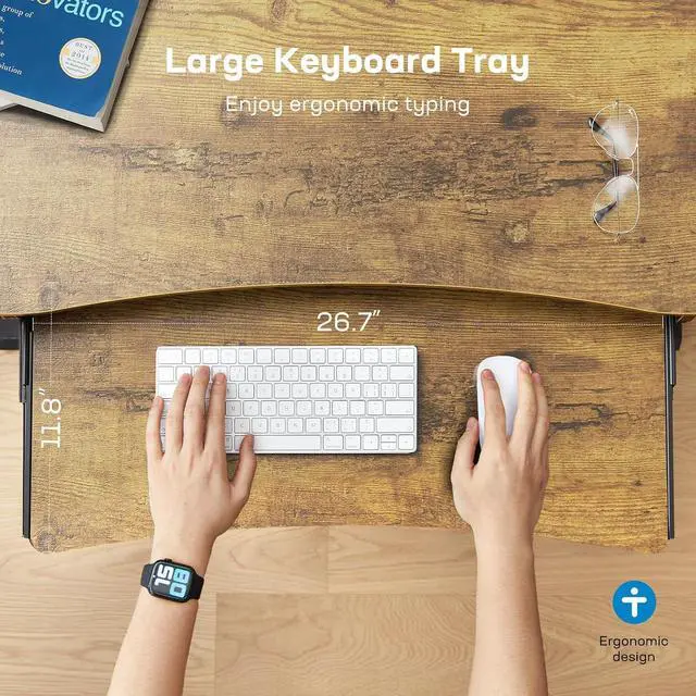 • Large Keyboard Tray: Our standing desk with drawers boasts a large 26.7 x 11.8 under-desk tray for a full-size keyboard. The smooth-sliding keyboard tray remains steady for every keystroke, promoting ergonomic arm and wrist positioning that is more comfortable.