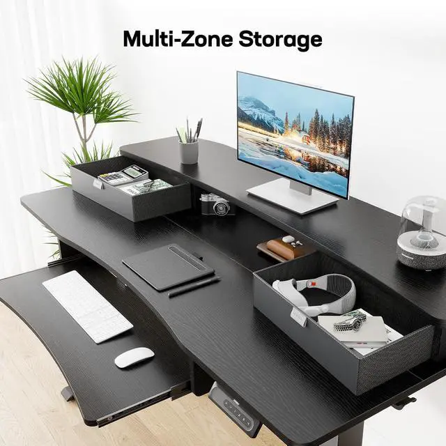 Multi-Zone Storage: The table top of this standing desk is made up of two boards. The computer desk with keyboard tray is designed with two drawers to store office supplies, an integrated monitor stand to display photos and collectibles, and an open cubicle for easy access to books or accessories. Experience improved productivity and comfort with a clutter-free and organized workspace.