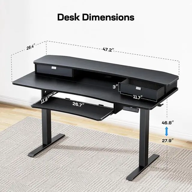 Large Keyboard Tray: Our standing desk with drawers boasts a large 26.7 x 11.8 under-desk tray for a full-size keyboard. The smooth-sliding keyboard tray remains steady for every keystroke, promoting ergonomic arm and wrist positioning that is more comfortable.