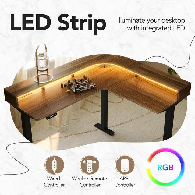 HUANUO L Shaped Electric Standing Desk with LED Strip & Power Outlets, 63" x 55" 2-Tier Height Adjustable Sit Stand up Desk, Large Corner Gaming Desk with Power Strip Holder, Walnut