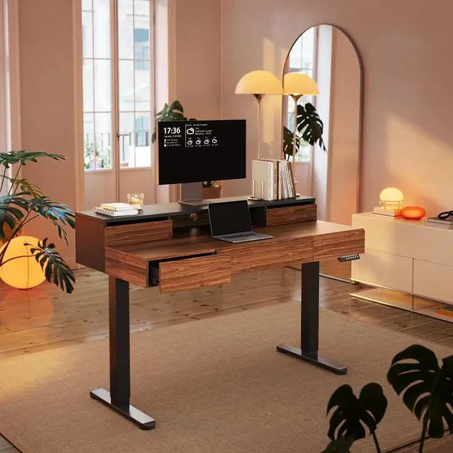 Raised Shelf for Added Functionality:The elevated monitor shelf frees up desktop space and positions your screen at an ergonomic viewing height, helping to reduce neck strain. The extra 2 wood drawers are great places for small items, the open area is perfect for decor, or additional accessoriesmaking your workstation both functional and stylish.