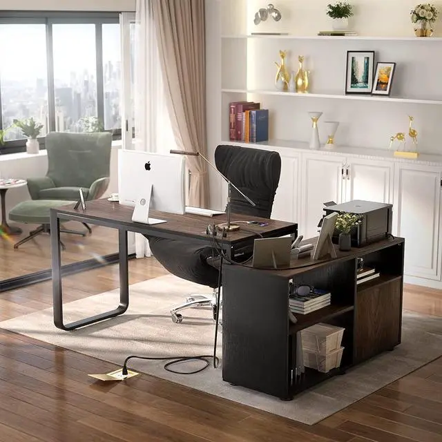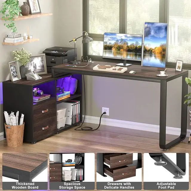 CORNER DESK WITH STORAGE CABINET - The desk comes with 2 drawers and 3 open storage shelves that offer plenty of space to hold office supplies neat and organized, make this l desk a space-saving and practical choice for home office. The adjustable shelf has 3 heights that can be adjusted for all your needs.
