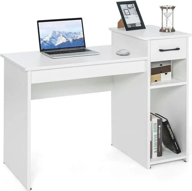 Large Desktop and Slide-out Drawer: The computer desk features a wide desktop to release you from a narrow working environment and keep everything you need within reach. In addition, the raised platform and storage drawer keep small items organized, thus freeing up more desk space.
