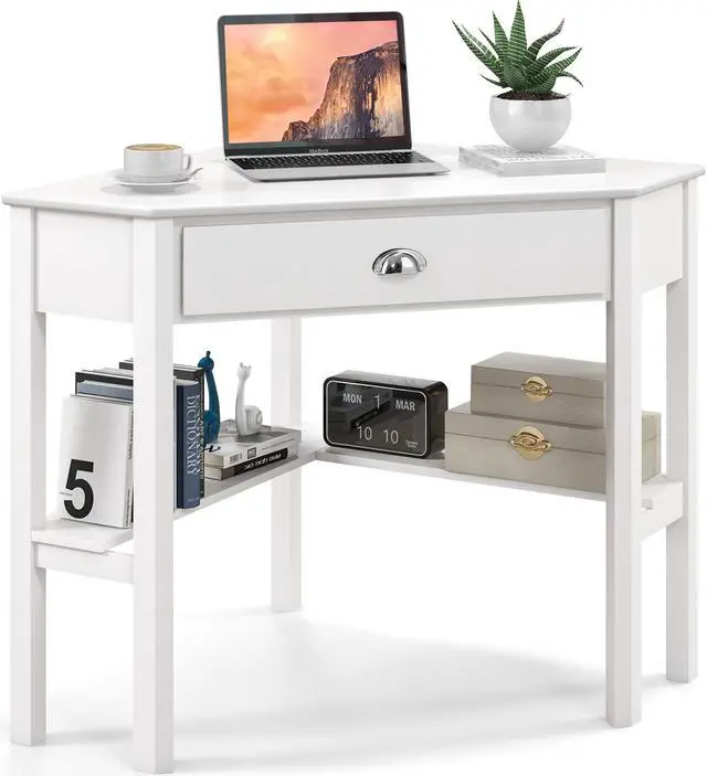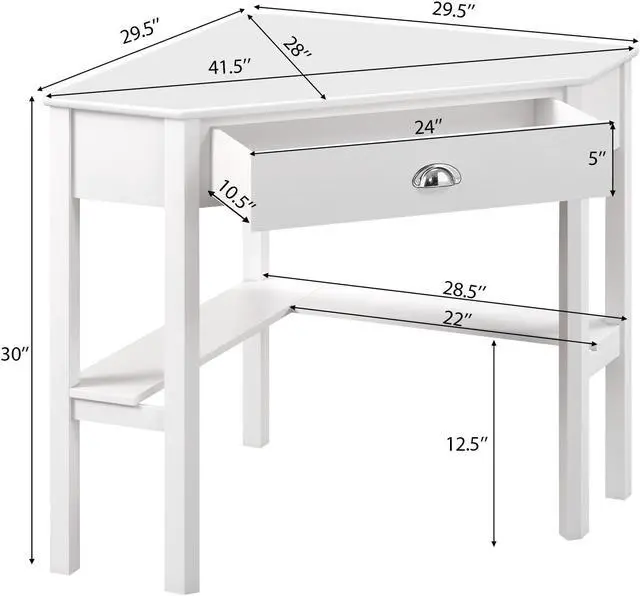 Compact and Corner Design: The design of this corner desk is classic and timeless. The corner desk can maximize space in compact rooms, such as apartment, dome, study room or office. The corner desk comes with enough tabletop to hold a laptop or other daily supplier, and there are one drawer and another bottom shelf to storage. The corner desk serves a variety of functions.