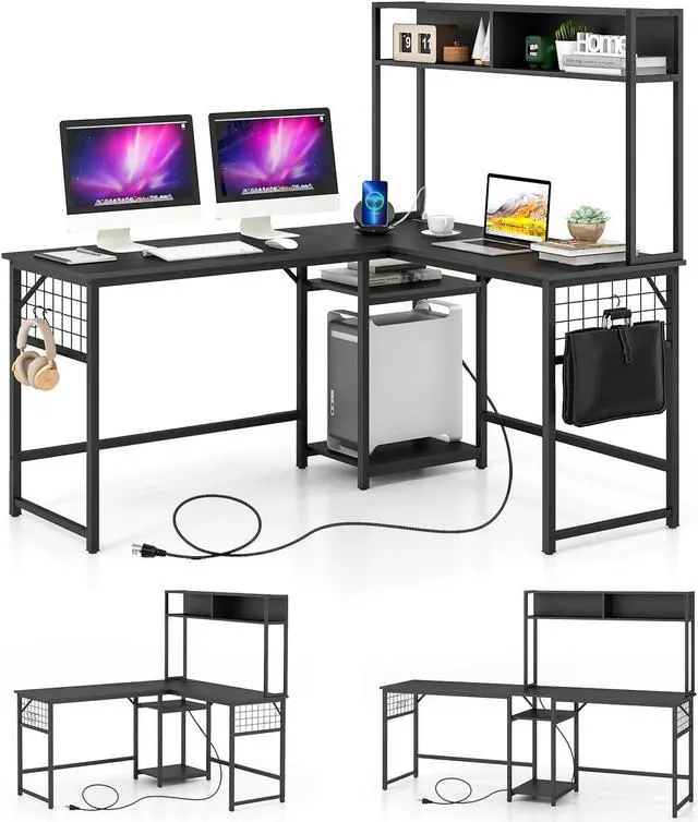 Ample Storage Solutions: Stay organized with the plethora of storage options this L desk provides. It features a spacious tabletop hutch, 2 open shelves, and metal grid with 3 removable hooks, allowing you to keep your essentials within reach and neatly organized.