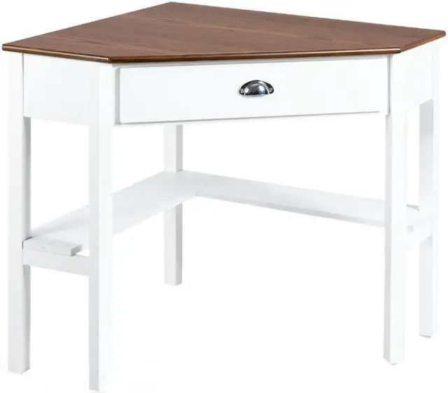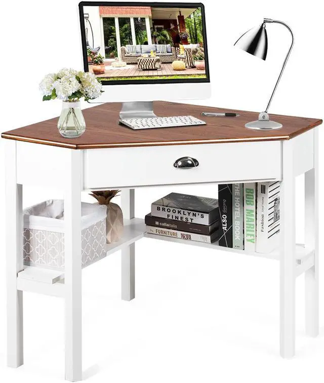 Compact and Corner Design: The design of this corner desk is classic and timeless. The corner desk can maximize space in compact rooms, such as apartment, dome, study room or office. The corner desk comes with enough tabletop to hold a laptop or other daily supplier, and there are one drawer and another bottom shelf to storage. The corner desk serves a variety of functions.