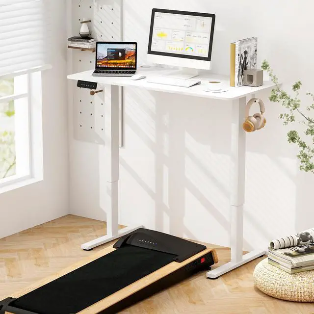 Sturdy Construction: Built for lasting stability, the stand-up desk accommodates your dynamic work needs. The solid metal legs with adjustable foot pads supports your setup without wobbling, while the powerful motor ensures whisper-quiet lifting.