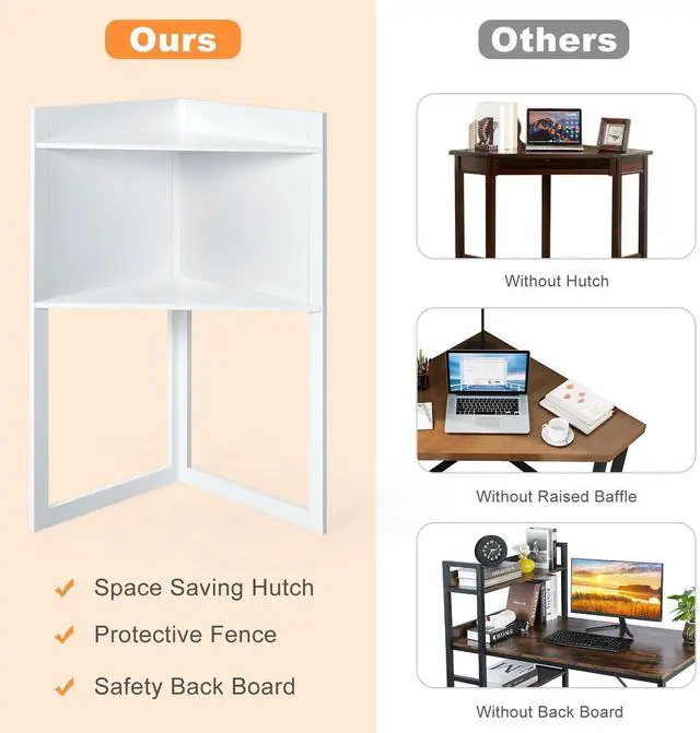 Attached Storage Hutch and Shelf: The corner desk features an open hutch for storing daily supplies and displaying decorative items. The protective fence on the edge of the hutch prevents your stuffs from falling down. Moreover, the bottom shelf offers enough space for your books and CPU stand.