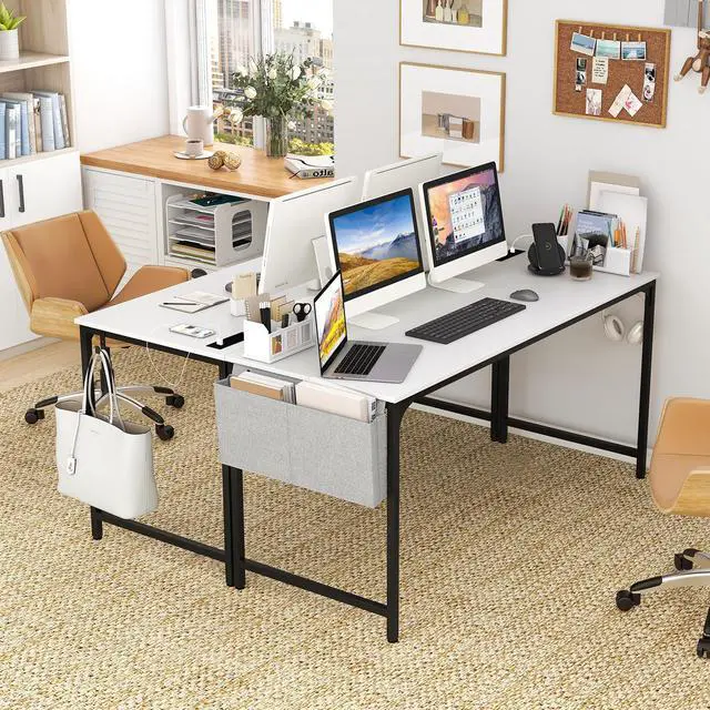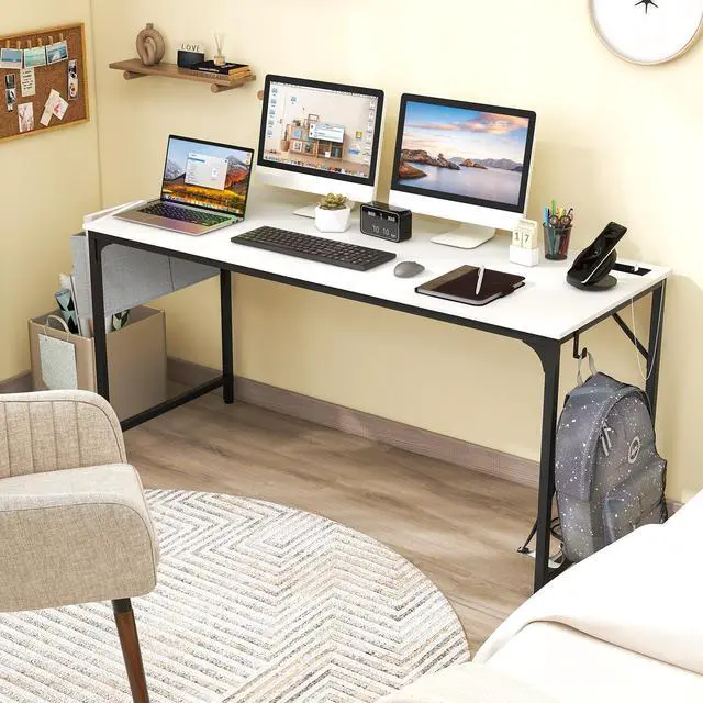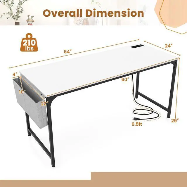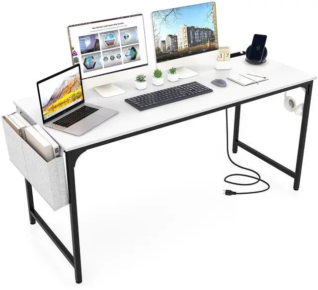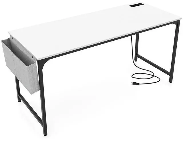 SlickBlue 60 Inch Computer Desk with Charging Station Storage Bag-White
