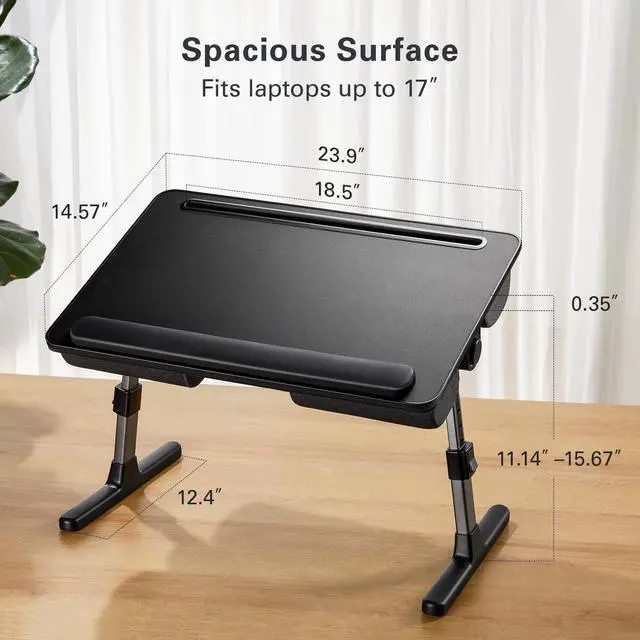2-in-1 Bed & Lap Desk: The laptop bed tray desk is designed with foldable legs and dual bolster cushions to allow the laptop stand to be used as either a workstation or bed tray. Ergonomic Workstation Setup: The foldable laptop table features 5 settings for height adjustment including 15.67, 14.5, 13.43, 12.2, and 11.14. The 0°-35° adjustable tilt angle helps to relieve neck and back discomfort. More Room For Your Legs: The laptop bed tray table provides a wide 20.1 amount of legroom underneath the desk for more comfort. The adjustable laptop stand is foldable for easy storage underneath or beside your bed, cabinet, or sofa. Four Comfort Cushions: Four soft and skin-friendly cushions are integrated into the bottom of the laptop bed tray desk to provide stability on flat surfaces. The bolster cushions also ensure comfort when working on your lap to keep your body insulated from device heat. Multifunctional Design: The laptop computer lap desk features a tablet and phone slot to store your display devices while you work. A support ledge runs along the front edge of the platform for wrist support and to keep your laptop from falling.