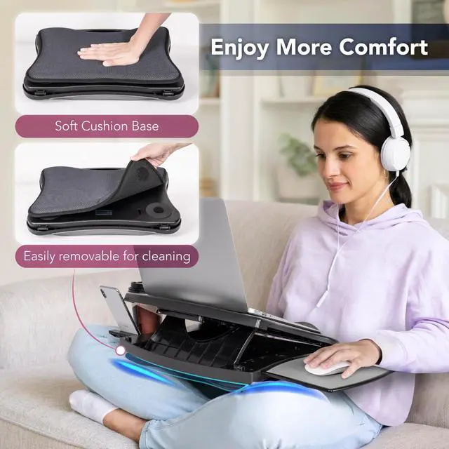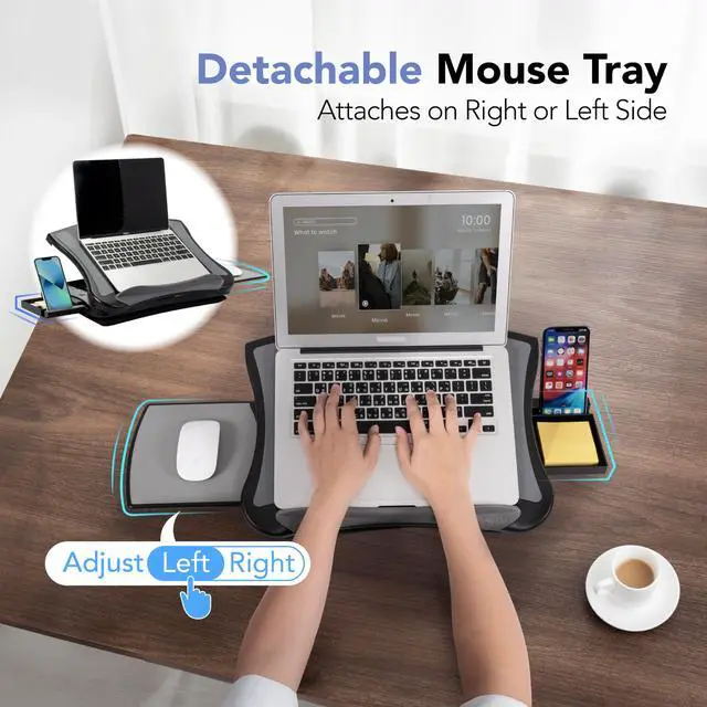 EHO Portable Lap Desk offers ergonomic comfort with 5 adjustable angles, a detachable mouse pad for left or right-handed use, a cushioned base, and a built-in phone holder. Lightweight and perfect for 12-17 inch laptops, it transforms any space—bed, sofa, or car into a productive workstation.