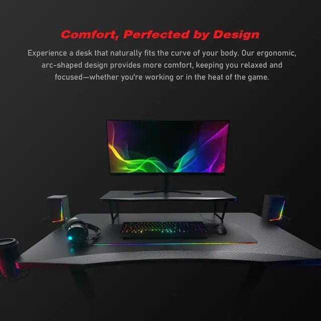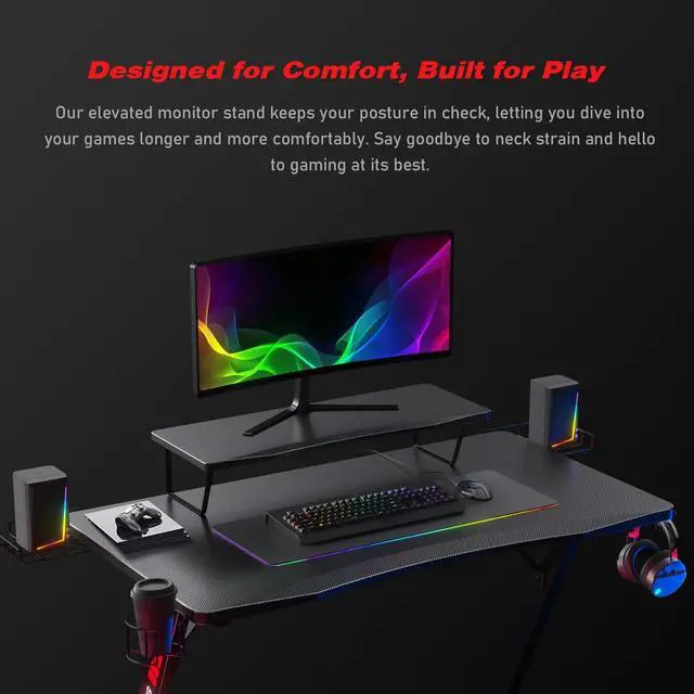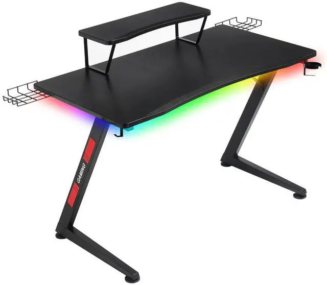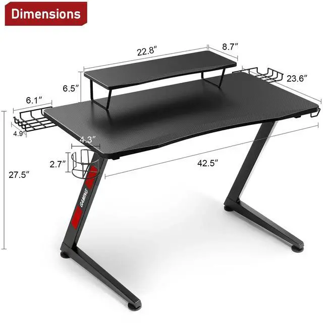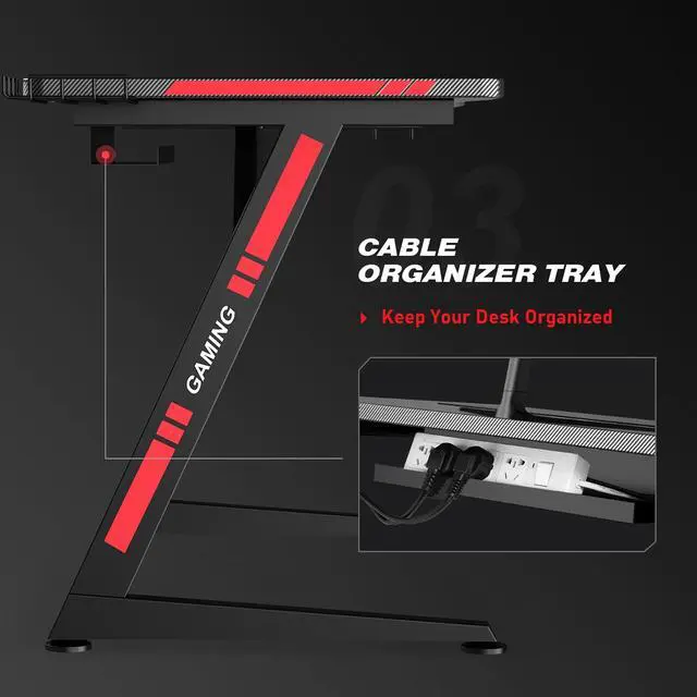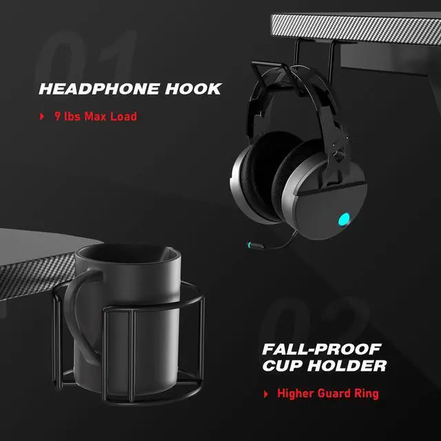 Elevate your gaming setup with our Z-Shaped Gaming Desk! The surface is fully covered in carbon fiber, offering a smooth touch while being scratch-resistant and waterproof for easy maintenance. Stay organized with the built-in headphone hook, ensuring your headset is always accessible and neatly stored. Enjoy your favorite drinks worry-free with the built-in cup holder that prevents spills and keeps your beverage close. The solid and sleek Z-shaped base enhances your gaming experience by providing excellent stability and a strong load-bearing capacity. With ample space for your gaming gear, keyboard, and monitor, this adult desk gives you room to conquer any game. Maximize functionality and style with this all-in-one gaming desk!